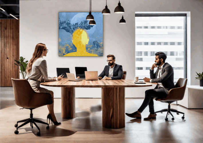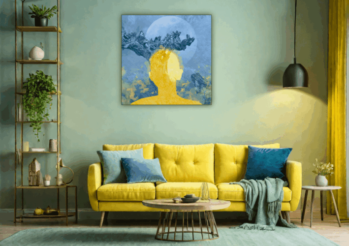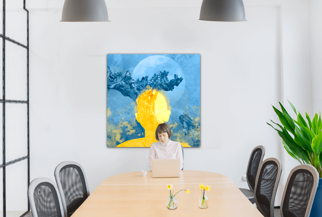 Bewonder de intense kleuren geel en blauw in deze kleurrijke fine-art foto In Awe. De foto, die meer doet denken aan een illustratie of een fotocollage, is een van de prachtige visuals voor een zakelijke werkruimte. Ook in een wooninterieur dat al kleurrijk is, heeft deze foto in augmented reality stijl een absolute meerwaarde. Of kies juist in jouw naturelle inrichting voor een kleuruitspatting.