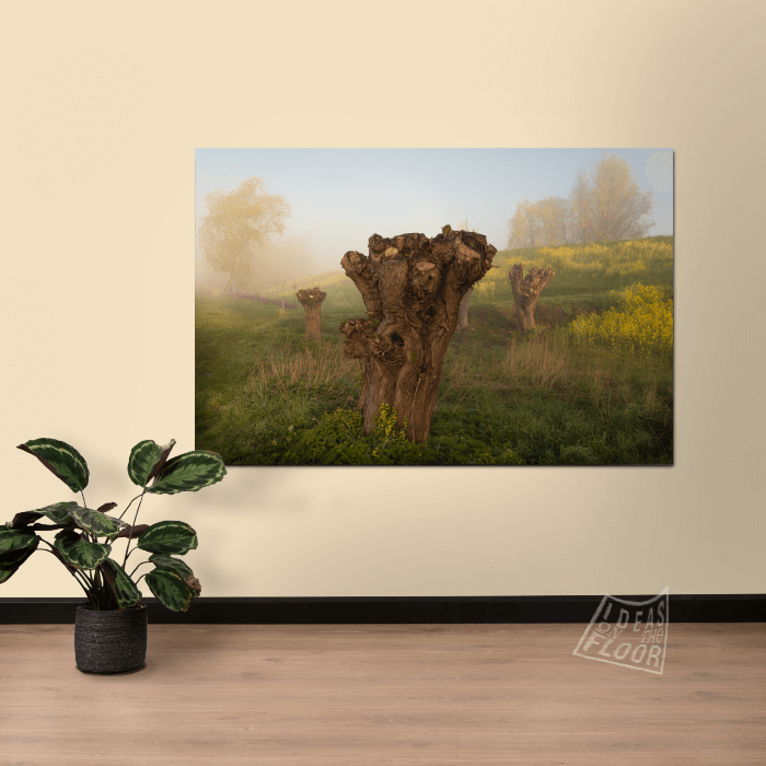 Deze adembenemende foto laat de prachtige landschappen van het Nederlandse platteland zien. In de achtergrond zie je dijkjes begroeid met felgele koolzaadbloemen die de horizon sieren. Op de voorgrond staat een geknotte wilg die de schoonheid van de natuur benadrukt. De foto is genomen bij een mistige ochtend en de zon begint de lucht al te kleuren met prachtige blauwe tinten. Het geheel geeft een fris en lenteachtig gevoel.