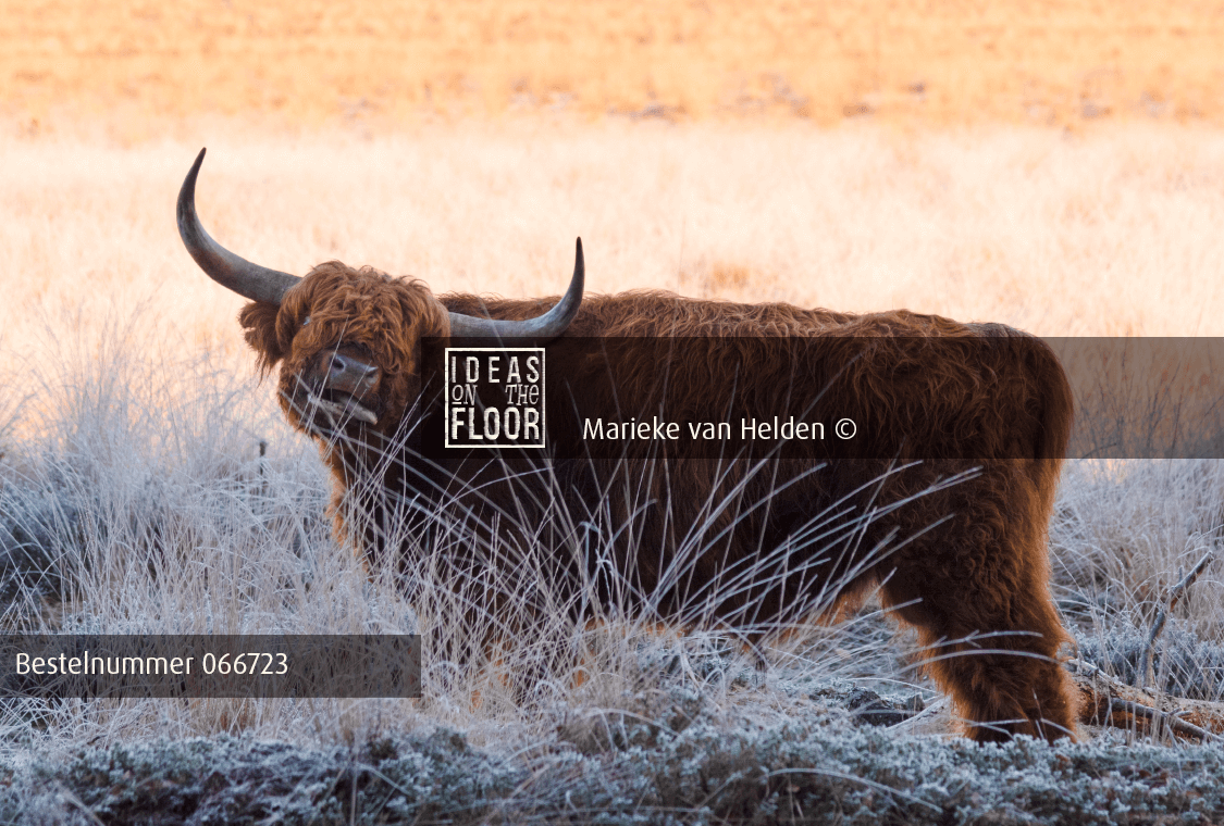 Bekijk de Schotse Hooglander eens van dichtbij met deze bijzondere foto Highlander. De hooglander steekt zijn tong uit, wat een grappig detail is in deze foto die eruit springt door een schitterend kleurgebruik die de compositie versterkt. De voorgrond is gevuld met ijzige blauwtinten en er hangt rijp op de planten en grassen. De achtergrond is zacht geel met oranje tinten, gevuld met de warmte van de opkomende ochtendzon op het veld met grassen.