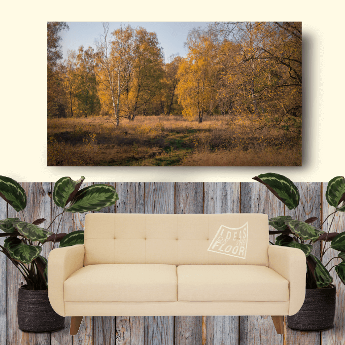 Maar ook in de woonkamer kun je deze panoramafoto van het herfstbos goed plaatsen. Doordat er voldoende voorgrond is, kun je nog prima een bank of een laag kastje voor de muur plaatsen.