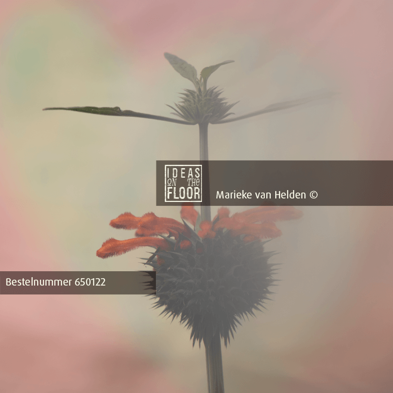 Dit werk heeft als titel Lion en laat bijzondere bloemblaadjes zien. Het is een best stekelige bloem waarvan de oranje bloembladeren wel iets weghebben van de staart van een leeuw. Om het stekelige te accentueren, is de bloem omringd door zachte tinten. De scherpe details van de stekelige bloemblaadjes vormen een prachtig contrast met de zachte groen- en roze gekleurde achtergrond. Het geheel heeft een unieke en mysterieuze uitstraling, waardoor het een echte blikvanger is. Ook over de bloem zelf loopt een vervagend effect.
