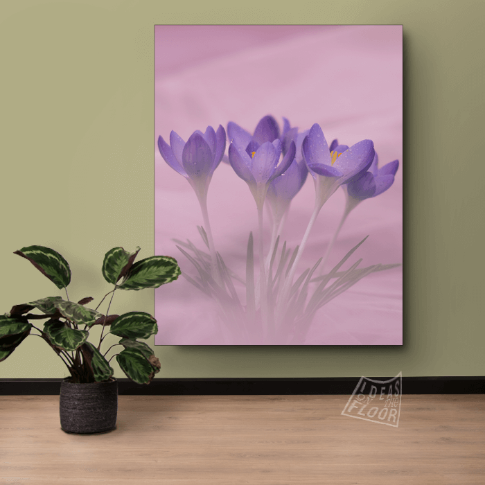 De foto Pink is een betoverend mooie close-up van een groepje paarse krokussen. De dauwdruppels en de bloemblaadjes van de voorste bloemen zijn haarscherp vastgelegd en geven de foto een frisse en levendige uitstraling. De achterste bloemen zijn meer vervaagd. De achtergrond is zachtroze en onscherp, waardoor de focus volledig op de bloemen komt te liggen. De voorste bloemen zijn ultrascherp en springen er echt uit, terwijl de achterste bloemen op een subtiele manier vervagen en bijdragen aan de algehele zachtheid van het beeld.