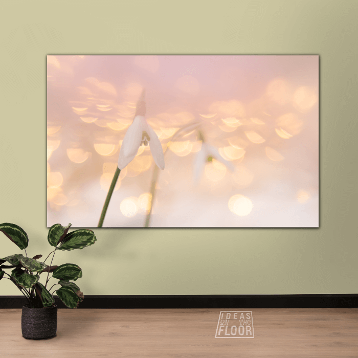 De zachte, oranje-roze sfeer en de twinkelende bokeh in de achtergrond geven de foto een dromerige uitstraling. Het is een bijzondere foto van sneeuwklokjes die je nog niet eerder hebt gezien. Een perfect beeld om je interieur mee te verfraaien of een perfect cadeau voor iemand die een groot hart heeft voor stinzenplanten.