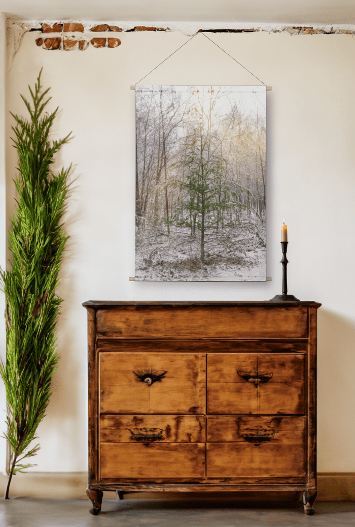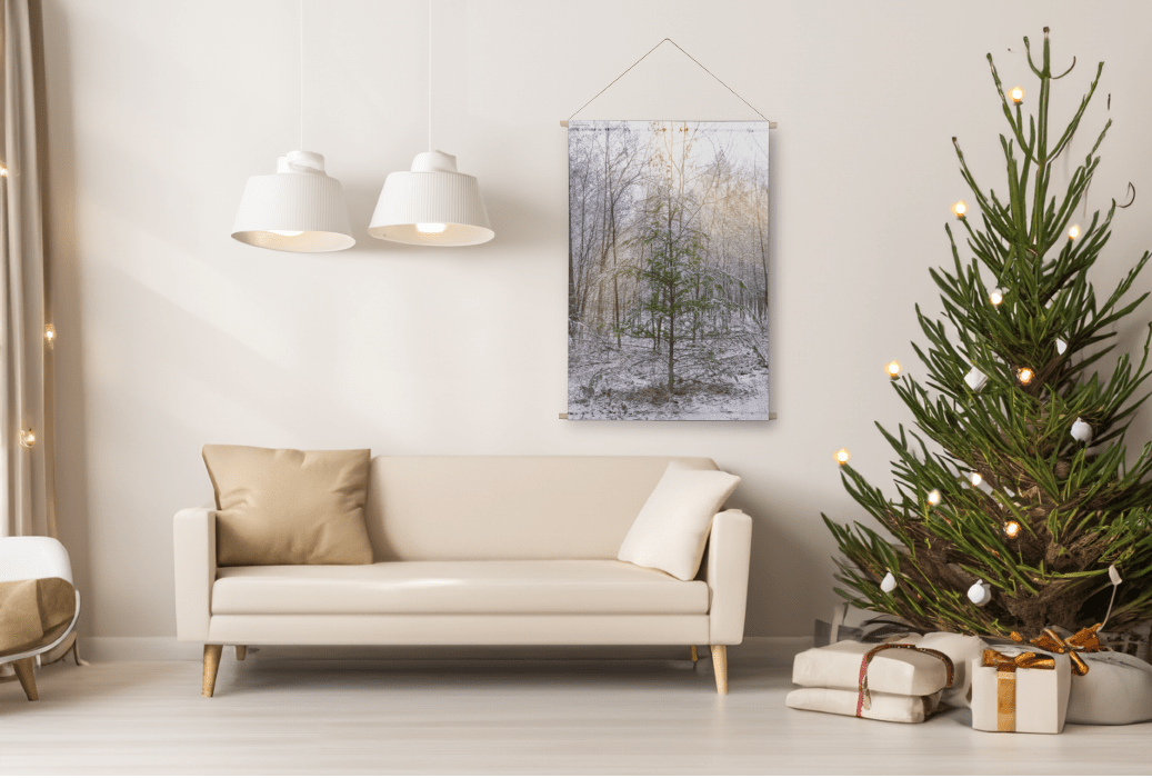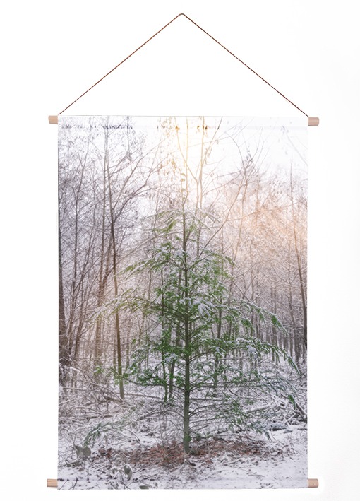 Wat is dit een lief en magisch kerstboompje in zijn warme omgeving. Met deze poster van textiel haal je op een originele manier verwerkte fotografie in huis. Op dit doek staat een magisch beeld van een lief dennenboompje in sfeervol zonlicht. De gebruikte kleuren in de zwartwit met kleur foto geven een eigentijds effect aan het beeld. Het materiaal is een soepele textiel van kreukvrij polyester en is dikker dan het xl wandkleed. Het materiaal van dit kerstboom wanddoek is wel dunner dan bijvoorbeeld een schoolplaat, het heeft een textiele uitstraling.
