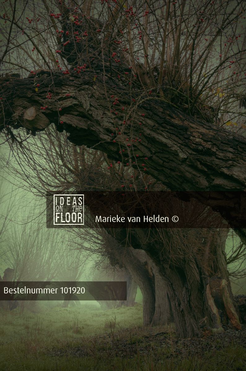 Deze mysterieuze en intrigerende kunst foto Old Feet, neemt je mee naar een opmerkelijk hoekje in het landschap.  De kale knotwilgen zijn gehuld in een zachte grijsgroene mist. De oude, knoestige bomen hebben een verhaal te vertellen, met hun gebogen takken en rode rozebottels die er doorheen groeien. De voorste wilg is half in beeld en geeft een gekke vorm in de voorgrond. Je vraagt je af wat er hier in dit mysterieuze hoekje gaande is geweest.