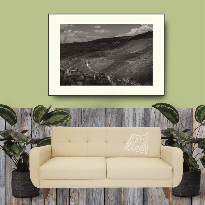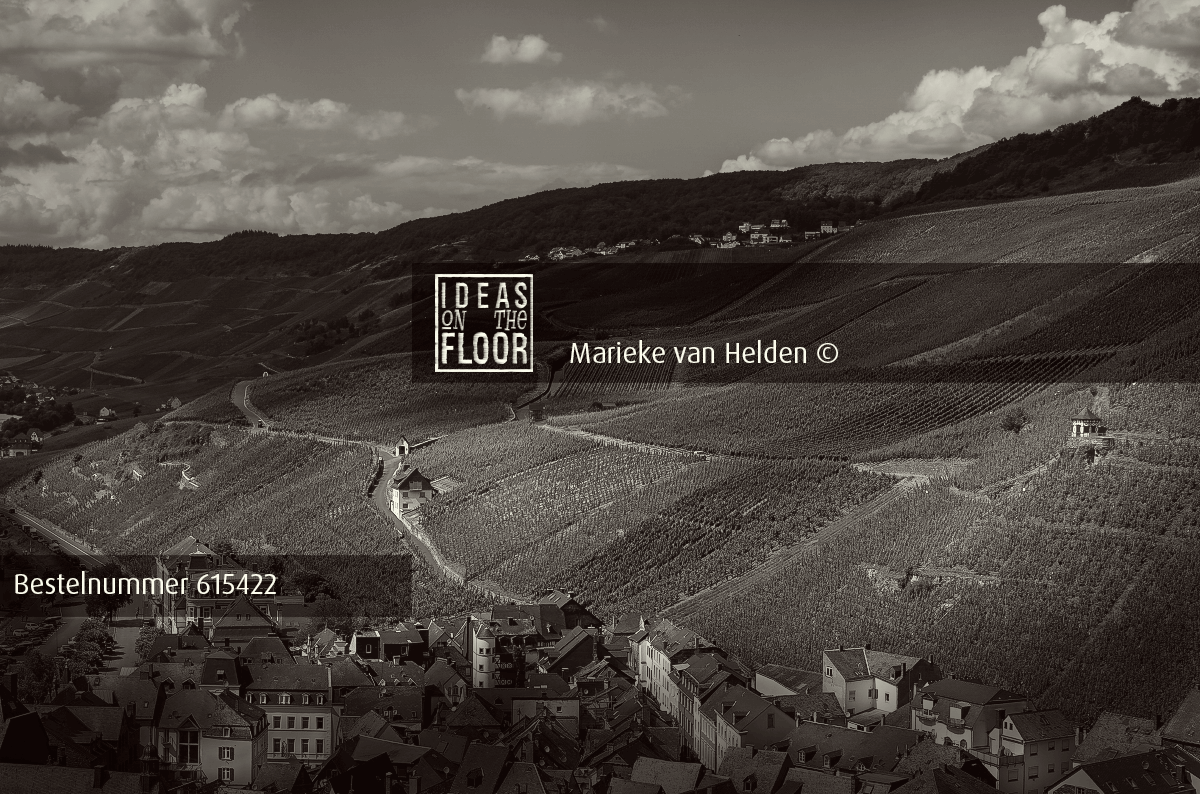 De zwart-wit weergave geeft een tijdloos gevoel aan de foto en benadrukt de contrasten tussen licht en donker. Stap in een wereld van structuur en dynamiek met deze foto van in heuvels met daarop de wijngaarden van de omgeving. De zon schijnt helder over de heuvels. Boven de heuvels drijven wolken langzaam voorbij en creëren een fascinerend spel van licht en schaduw over de wijngaarden en het dorpje aan de voet van de heuvel.
